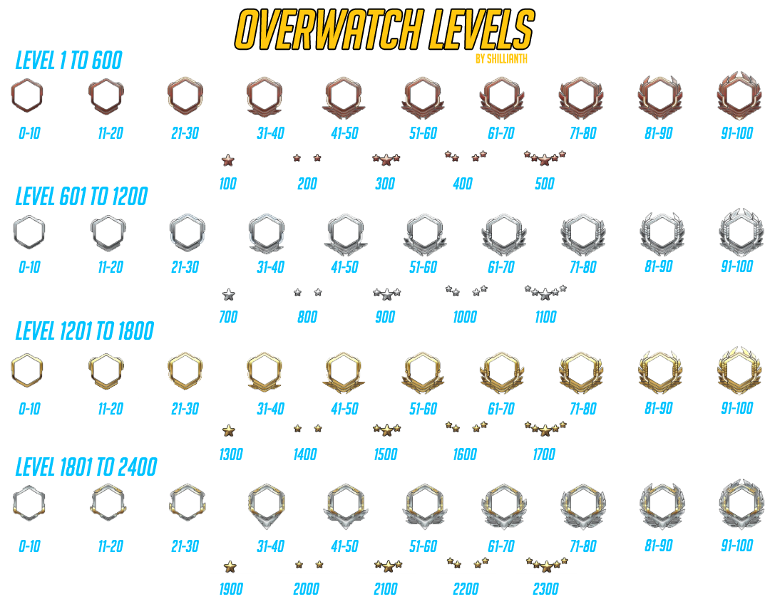 오버워치의 레벨은 10단위로 올라갈때마다 초상화가 업그레이드되며, 100단위로 올라갈때마다 인장밑에 별(★)이 1개씩 추가된다. 별 다섯개가 채워지는 600레벨, 1200레벨, 1800레벨을 넘기면 초상화 색깔이 은색, 금색, 금색+백금색 으로 바뀐다. 이런식으로 변하는 형태는 2018년 중반까지만해도 2390레벨까지 존재하며 2391레벨 이상은 인장이 그대로 유지되지만 레벨은 꾸준히 올라갔었지만, 2018년 말에 2401레벨부터 2991레벨까지의 새로운 레벨이 나왔다