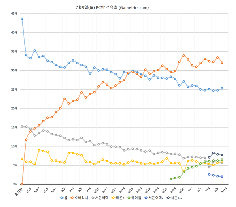 최근의 추세를 보면 오버워치의 지속적인 점유율 하락으로 롤에게 평일에 6~7% 격차로 밀리고 주말에 10%격차로 밀리고 있다.