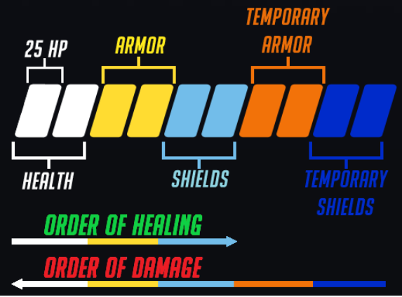 방어력(Armor): 인게임에서 노란색으로 표시되는 생명력. 일부 영웅들이 기본적으로 갖고 있는 생명력이며 주로 돌격 영웅들이 기본적으로 가지고 있다. 광선 계열 무기를 제외한 무기로 방어력에 피해를 받으면 자신에게 들어오는 10 이상의 피해를 5씩 감소, 10 이하의 피해는 50%를 감소시킨다. 예를 들어 30의 피해를 입게되는 경우에는 5가 감소되어 25의 피해를 입고, 10의 피해를 입게되는 경우에는 반으로 깎여 5의 피해를 입는다. 한편 광선 계열 무기[22]로 방어력에 피해를 받으면 30% 만큼 줄어든 대미지가 들어온다. 또한 지속 피해를 주는 공격[23]에 경우 방어력에 의해 감소되는 대미지는 없고 고스란히 피해를 입는다.
