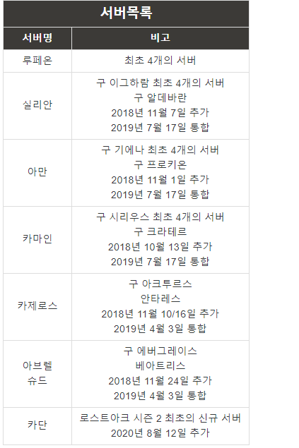 처음에는 루페온, 이그하람, 기에나, 시리우스 서버로 시작되었으며. 2019년 4월 3일 9개 서버로 통합되었다. 2019년 7월 17일 현재 6개 서버로 운영 중이다.
