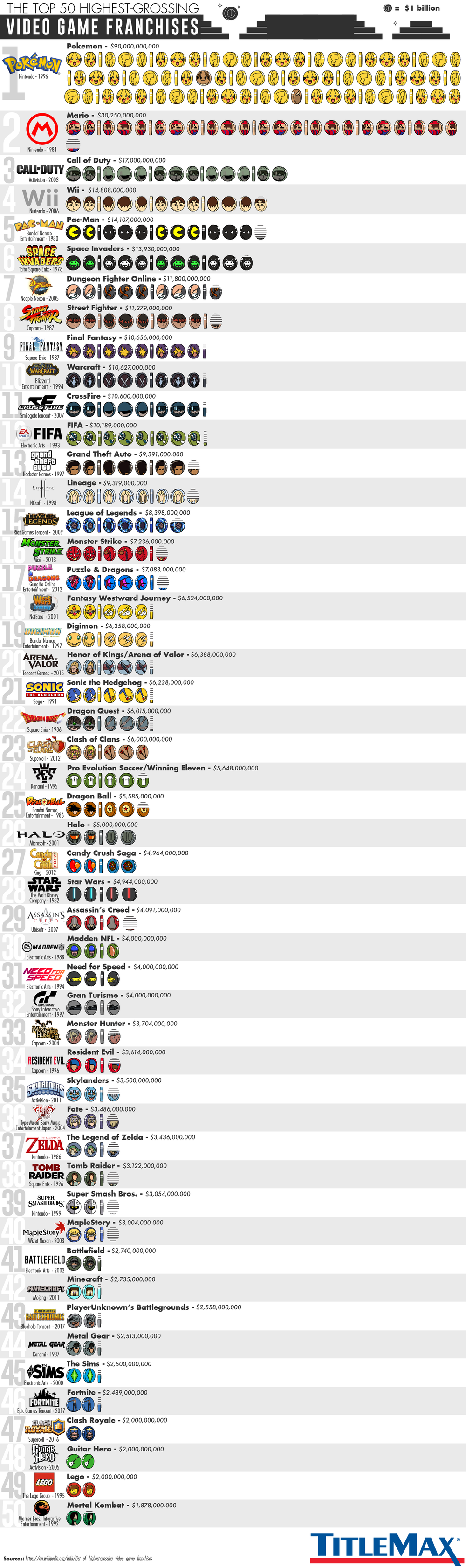 미국 최대의 지식재산권 유통, 중개기업 타이틀맥스에서 집계한 세계 비디오 게임 프랜차이즈 매출액 순위. 이 자료는 단순히 게임 판매량 뿐만 아니라 미디어 믹스를 통한 로열티 수익을 모두 합친 누적 수익이다. 자료