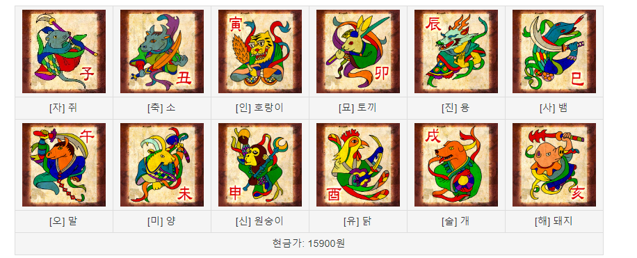 15,900원을 들여서 12지의 보호를 받는 부적을 살 수 있다. 각각 능력이 다르며, 장착시 전투중 뒤에 그 12지가 보인다.